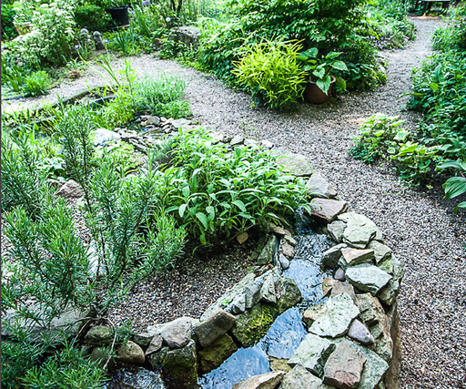 Bachlauf und kleine Teiche kombiniert mit einer großen Kräuterspirale bestimmen die weitere Gestaltung mit verschiedenen Sitzplätzen und einer