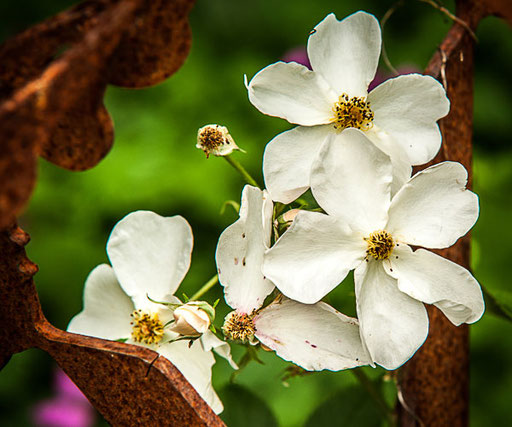 Etwa 100 zum Teil sehr selten gepflanzte Rosen runden das Gartenbild mit anderen Kletterkünstlern wie Clematis ab.